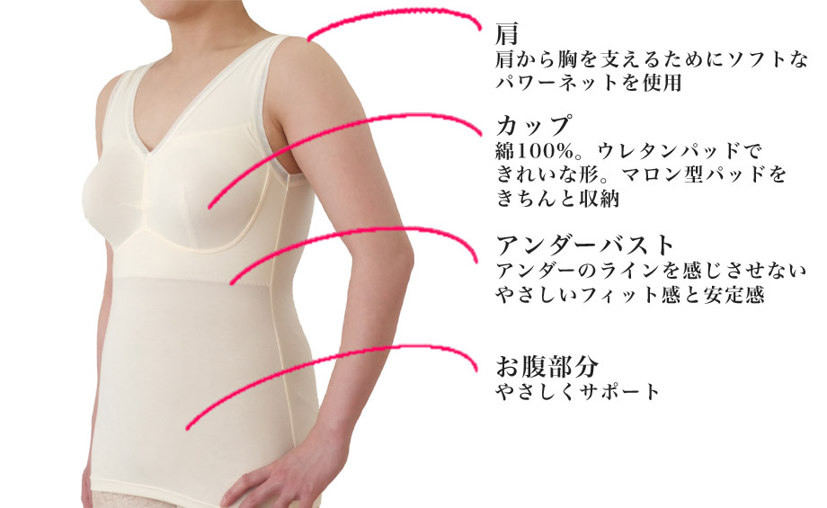設計と縫製技術で、あがったり、ずれたりしない工夫。肩や脇、アンダーがポイント。